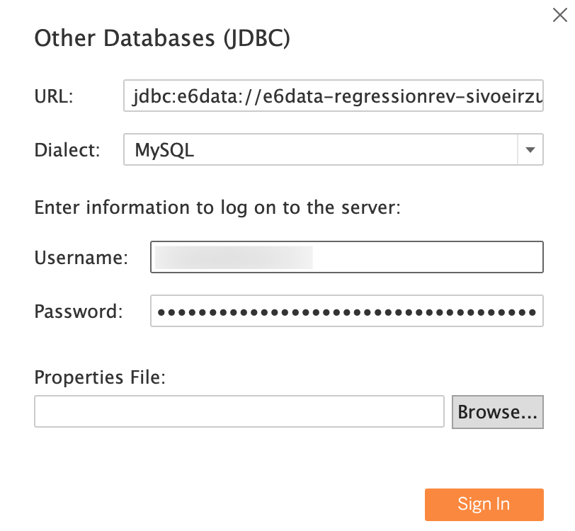 * Enter the e6data JDBC URL and select MySQL as the dialect.