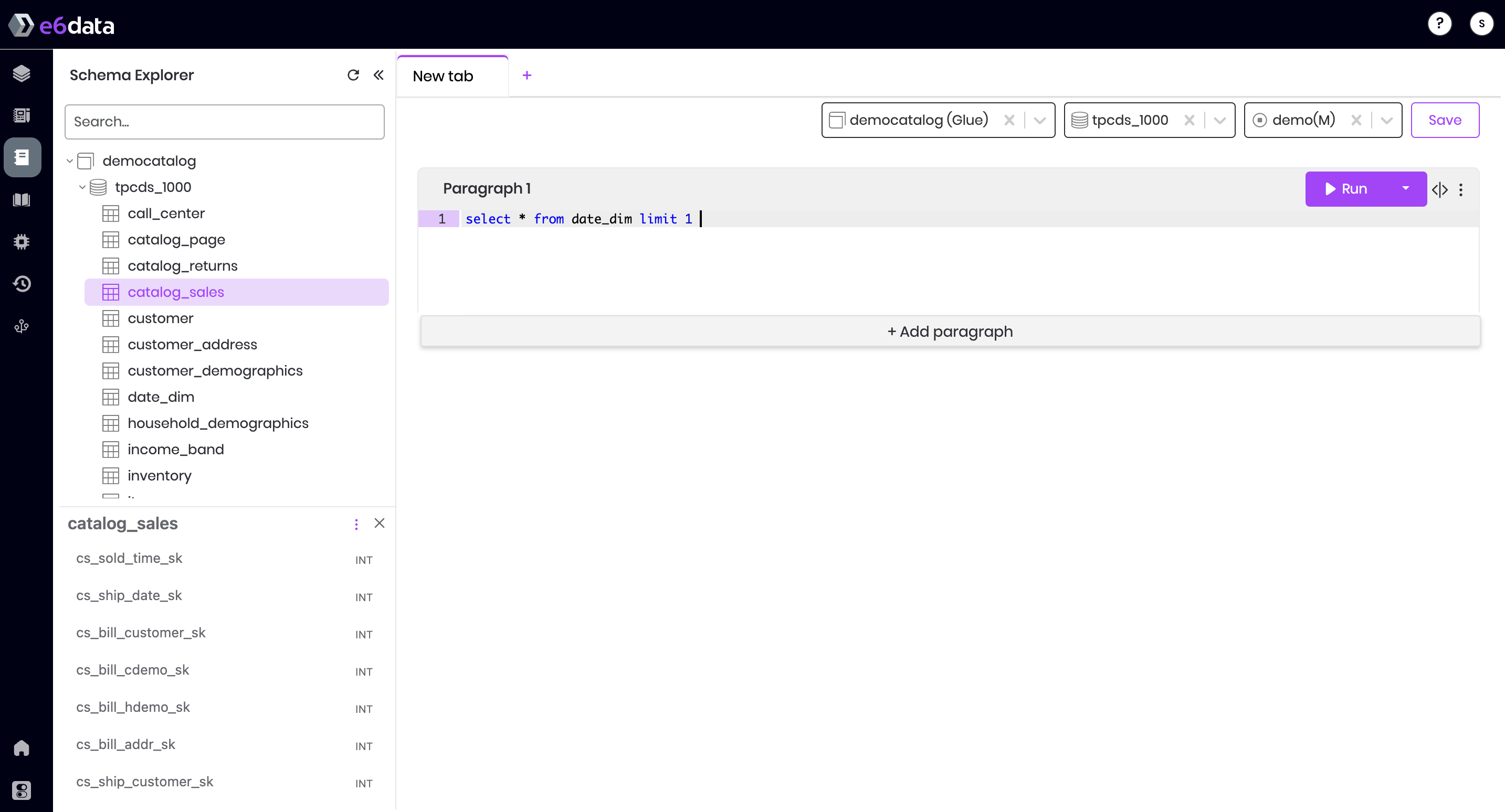 The ***Schema Explorer*** pane on the left can view **AVAILABLE** & **ACTIVE** catalogs connected to the clusters. The ***Schema Explorer*** pane displays all catalogs, databases & tables in a hierarchical, expandable tree diagram.&#x20;